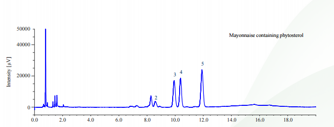 Dưới đây sẽ minh họa phân tích một số mẫu chuẩn của bốn loại phytosterol và cholesterol (Hình 1) bằng cột UHPLC Unifinepak C18 – Jasco với kích thước hạt 1,9 μm. Ngoài ra, một loại mayonnaise chứa phytosterol (I) và một loại mayonnaise thông dụng trên thị trường (II) cũng được tiến hành phân tích song song.
