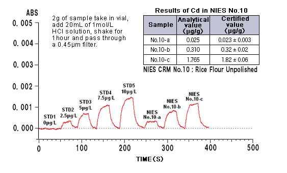 Dòng ZA3000 sử dụng phương pháp hiệu chỉnh Zeeman phân cực để hiệu chỉnh đường nền đối với phương pháp ngọn lửa. Thiết bị cung cấp độ ổn định cao, do đó có thể phân tích đầy đủ 0,4 mg/kg cadmium trong gạo lứt. Giá trị phân tích thu được nằm trong phạm vi giá trị được chứng nhận, cho thấy rằng các quy trình từ chuẩn bị đến đo lường đã được thực hiện chính xác.